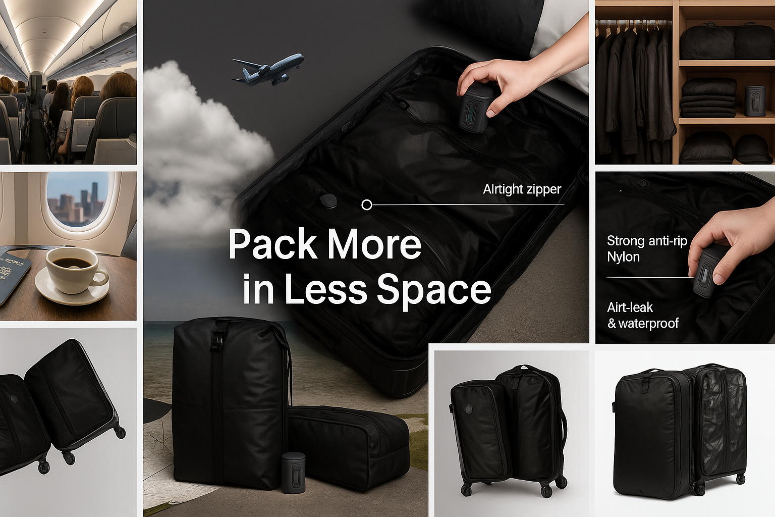 Our compression bags are designed specifically for travelers, featuring durable materials and a portable USB-C rechargeable pump. This means you can re-compress your luggage anytime, anywhere — without relying on hotel vacuum cleaners or bulky equipment.